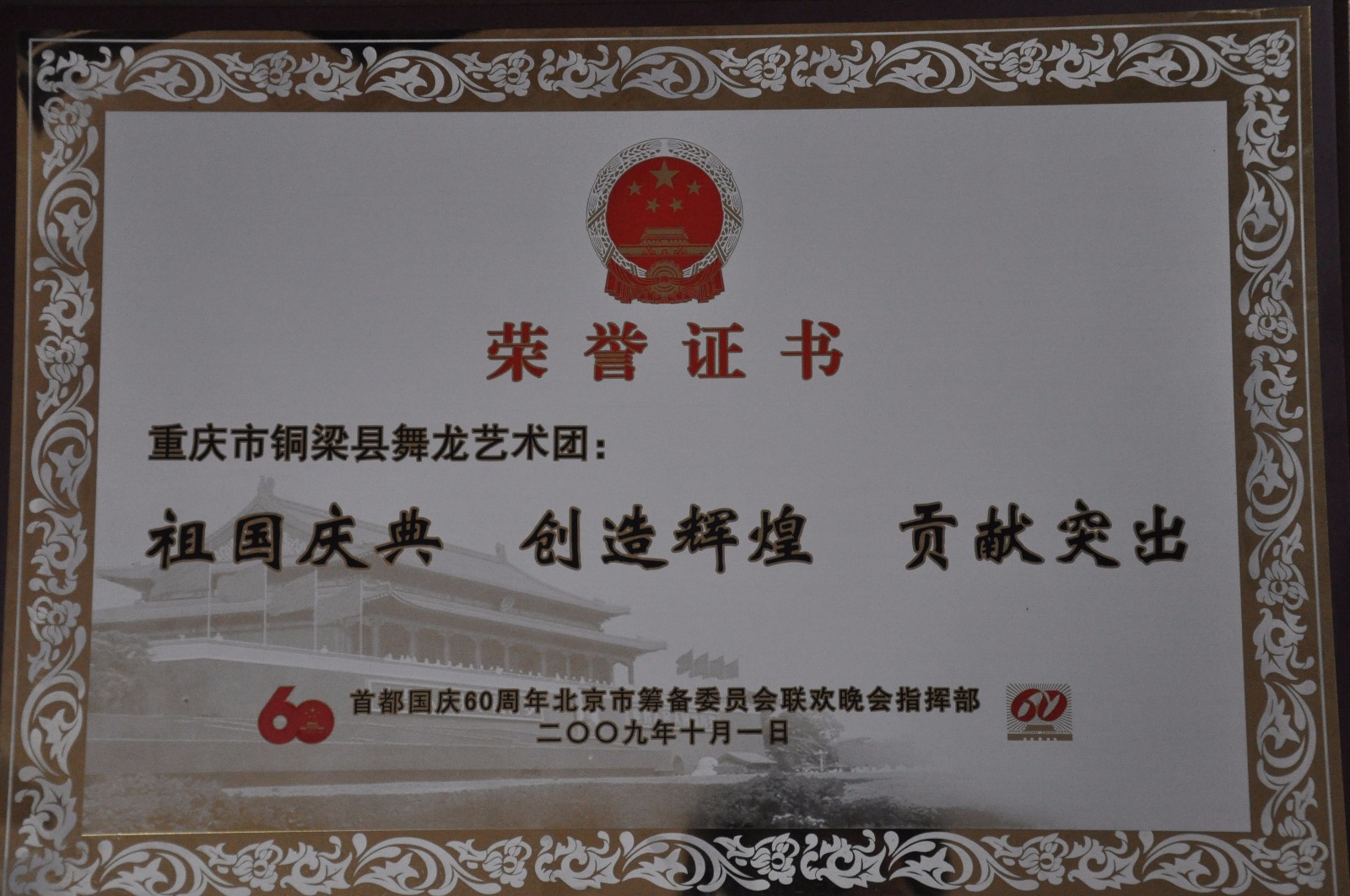 60周年國慶突出貢獻榮譽證書